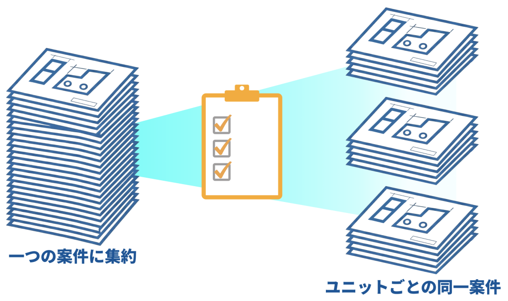 「案件集約」のスピードが劇的に向上します。 最大500件のファイル登録拡大に対応し、ユニットごとの同一案件もクリップボードひとつで丸ごと集約。案件を何度も行き来する手間をゼロにし、スマートな情報管理を実現できます。その他、別案件で共通の図面がある場合も、過去の見積データをコピーして流用することが可能です。